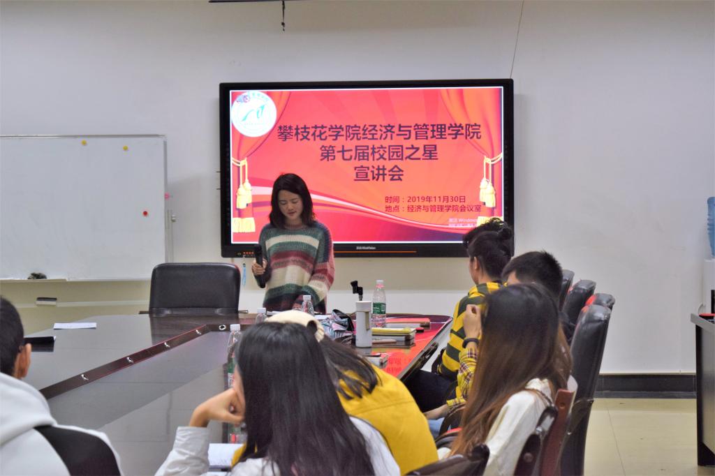11月30日下午,我院在明德楼二楼经管会议室举办第七届校园之星宣讲会。本次宣讲会的主讲人为攀枝花学院第七届校园之星文体之星经济与管理学院周浩然同学、攀枝花学院第七届校园之星创业之星提名奖经济与管理学院何凯同学,我院分团委书记胡遵程出席本次宣讲会,大一、大二各班级代表参加宣讲会。