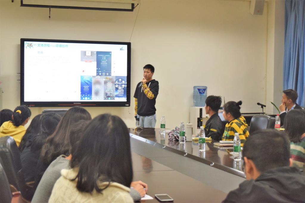 宣讲会开始,胡遵程向校园之星获得者送上纪念品。何凯同学、周浩然同学分别就自身创业团队建设情况、学生组织工作经历和组建乐队、歌曲创作的经历等方面与同学们进行分享,并讲述自己的未来规划,希望大家都坚守自己的梦想,不懈奋斗,砥砺前行。